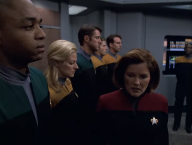 Soon the Equinox’s warp core is attacked by the aliens and Janeway is unable to save Ransom who wishes to go down with his ship and face his punishment. Janeway is able to rescue some of the Equinox’s crew just before the other ship explodes. Janeway informs the five new crewmembers that they will have to prove themselves on her ship by starting at the bottom once again. Stripping them of their rank she sends them off with Tuvok.