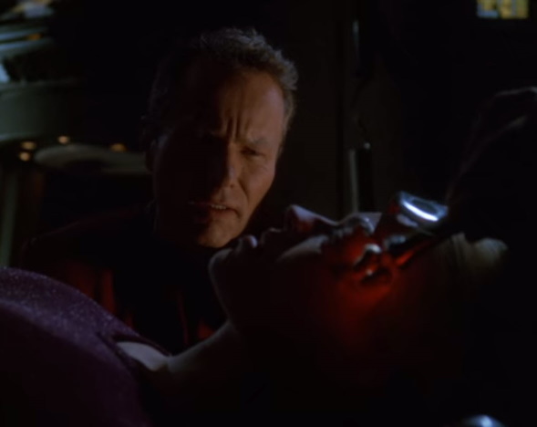 As the ‘Evil’ Doctor treats patients on Voyager, Ransom attempts to convince Seven to join him but to no avail. After being sent to sickbay, she soon discovers that the Doctor is from Voyager and it is up to them to stop Ransom and his crew. Just as the ship is about to go into warp, it stalls and Ransom discovers that Seven has sabotaged his engines preventing the ship from using the alien bodies as fuel. Determined to get his answers he alters Voyagers Doctor by deleting his ethical subroutines so that he will extract the information from Seven forcibly.