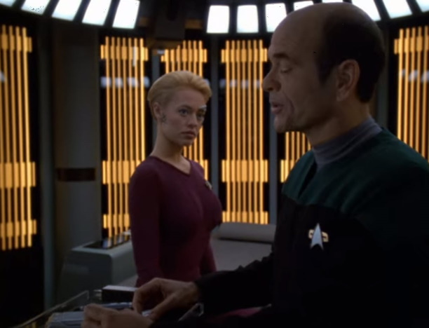 On the Equinox, Ransom needs to find more aliens to use as fuel and soon finds that The Doctor is almost done getting information from Seven. Taking a reprieve in a Synaptic Simulator, Ransom is shocked to find a nucleogenic lifeform in the form of Seven of Nine demanding that they find another way home. He soon learns that Voyager has found them.