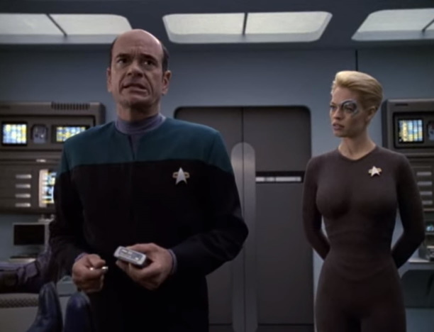Digging up the files, they soon discover that there is a gap in the memories which seems to be where this information is stored.ย Unable to find this gap in the files, they soon realize that Seven may need to link with the mini-collective in order to help them remember.ย It is dangerous as Seven herself may end up trapped in this collective, but she is determined to help them as Janeway once helped her.