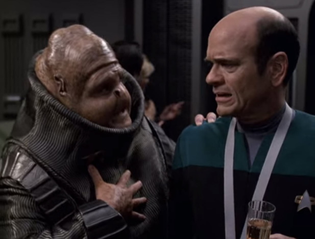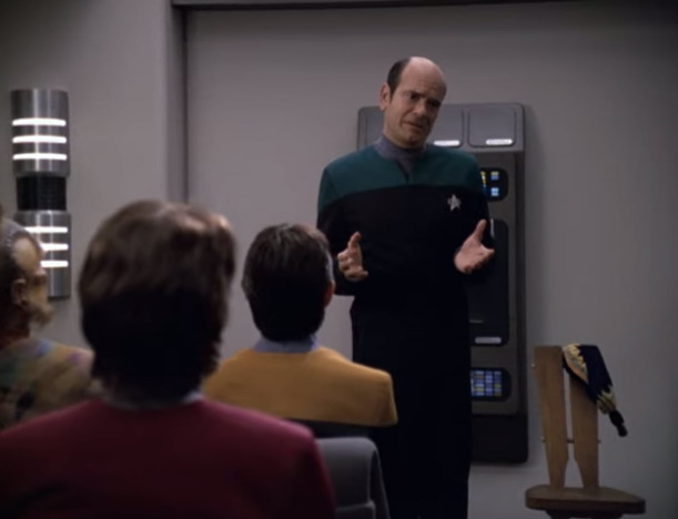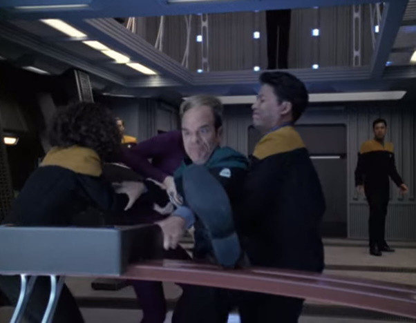 What I love even more about this episode is that it is one that is all about perspective. While it is not unheard-of for the Doctor to tinker with his program, little do the crew know that it is through this tinkering that he has managed to deceive spies who wish to harm the ship and crew. This allows for some classic humor through misunderstanding giving us one of the most lighthearted and enjoyable episodes this season, if not this series. Interestingly, although the episode’s title is in reference to the classic Tinker Tenor, Soldier Spy, the episode’s story has more akin to the famed 1947 Danny Kaye film The Secret Life of Walter Mitty which was based on a book byt the same name. In Walter Mitty, Danny Kaye plays a man who falls into daydreams to escape the abuse of his home-life, work-life, and well, just about all of his life. Of course that story takes a heroic turn as well as Mitty finds himself in a real-life adventure not unlike the one’s in his head. I highly recommend this classic as it is a terrific flick and Danny Kaye is tremendous on the screen.