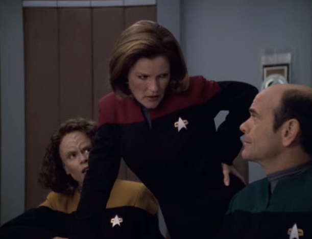 The two begin to discuss the matter and, although Janeway is skeptical about the Doctor’s proposals, she does find it fascinating. The idea of his program becoming an Emergency Command Hologram in the event the crew is incapacitated is an intriguing one. She promises that, once they return home, she will recommend that Starfleet look into this possibility but, much to the Doctors disappointment, Janeway feels that they simply do not have the means to implement this plan aboard Voyager.