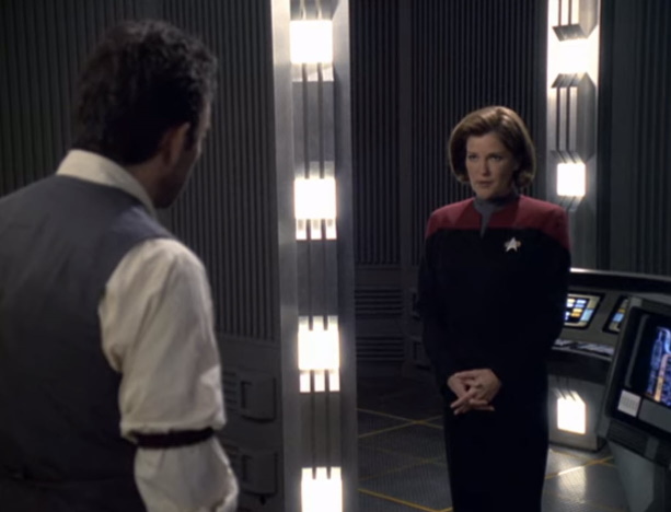 Okay, now that that is out of the way I have to say this episode is actually very likable story that, although it doesn’t really make sense in the overall narrative of Voyager, it does give us some down time in between the intense stories we have faced so far. This episode allows us to see the crew take some down time which is nice, especially for Janeway who never seems to get a chance to relax and certainly never gets a chance for romance seeing that she is the highest ranking member of the ship.