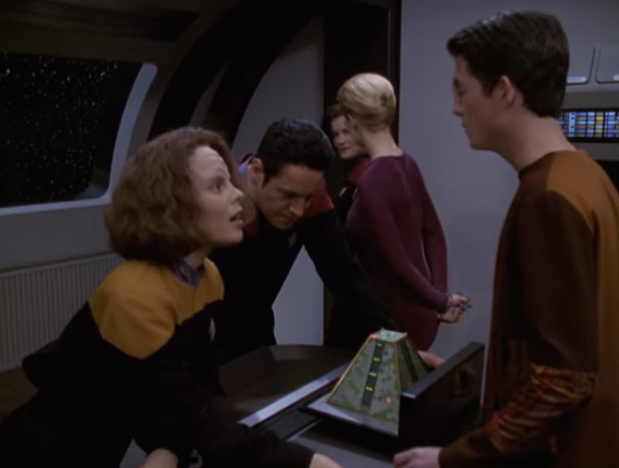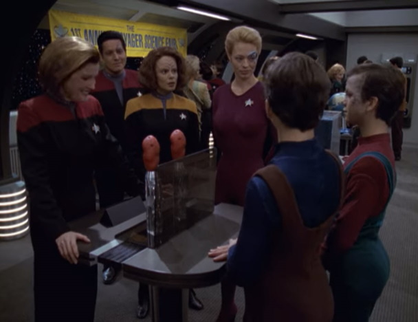 After a successful science faire with Naomi and the Borg Kids…(hey…that sounds like a band) where Icheb shows an aptitude for engineering and astrophysics, Janeway informs Seven that they have found the young man’s homeworld and expect to reunite him with his family soon.