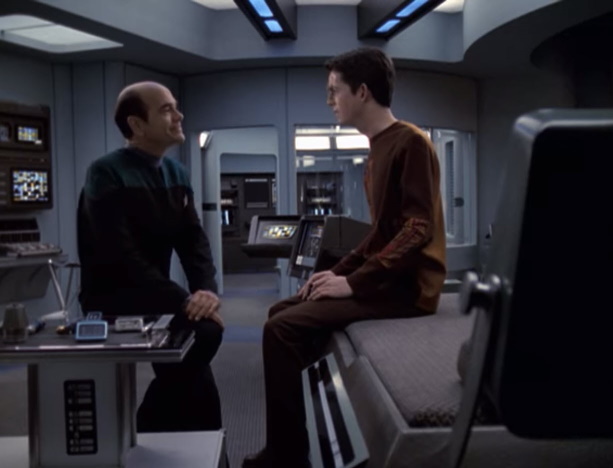 Seven breaks the news to Icheb who finds the attempt to be ingenious but Seven corrects him, stating that what his parents did was unacceptable as it was not Icheb’s choice to be used in such a way. They discuss the matter and come to a silent agreement that Icheb will continue his studies aboard Voyager as somewhat of an adopted child of Seven.