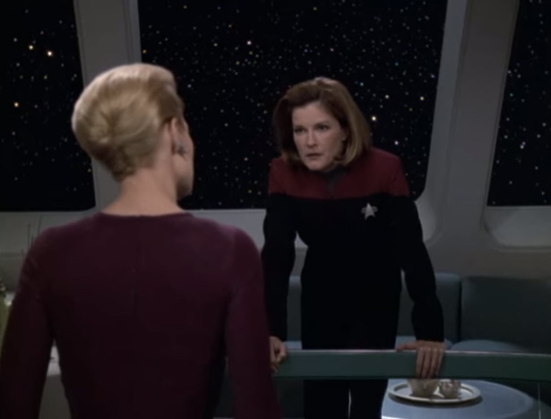 In Janeway’s ready room she and Seven come to a heated discussion where it becomes clear that Seven is projecting her own parental issues onto Icheb’s parents knowing that there is a risk that Icheb will be assimilated again if he should remain behind. Seven soon admits that this is a factor in her uncertanty and Janeway promises to leave the decision up to Icheb. If he chooses to remain on Voyager, they will deal with that however they can.