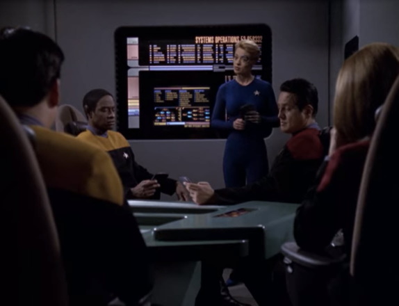 Captain Janeway takes a group of low-ranking crewmembers on a journey to help encourage them to find their place on the ship.