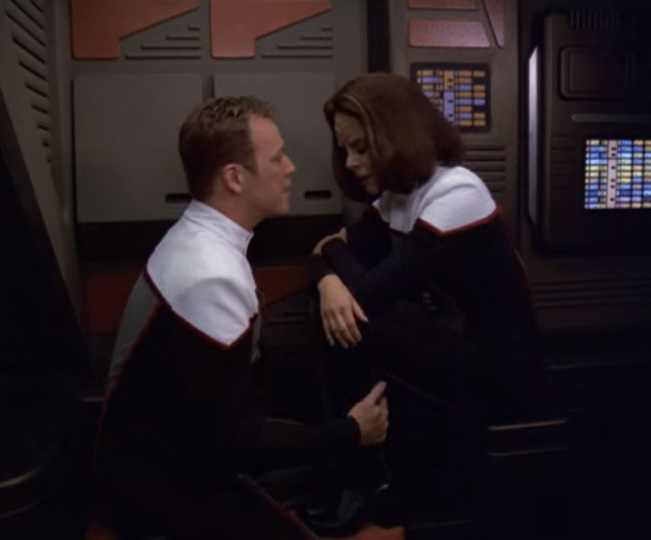 Despite the excitement, B’Elanna is not happy with Tom as the race will take place during their planned weekend getaway that she has been saving up for. Even though she knows he didnt do it on purpose, she feels that he simply does not consider her feelings and plans to break up with Paris once the race is completed. However, after talking with Seven, B’Elanna realizes that this is an opportunity to do something with her boyfriend and, much to Tom’s surprise, she replaces Harry as his copilot and the two prepare to work together to bring glory to the Federation.