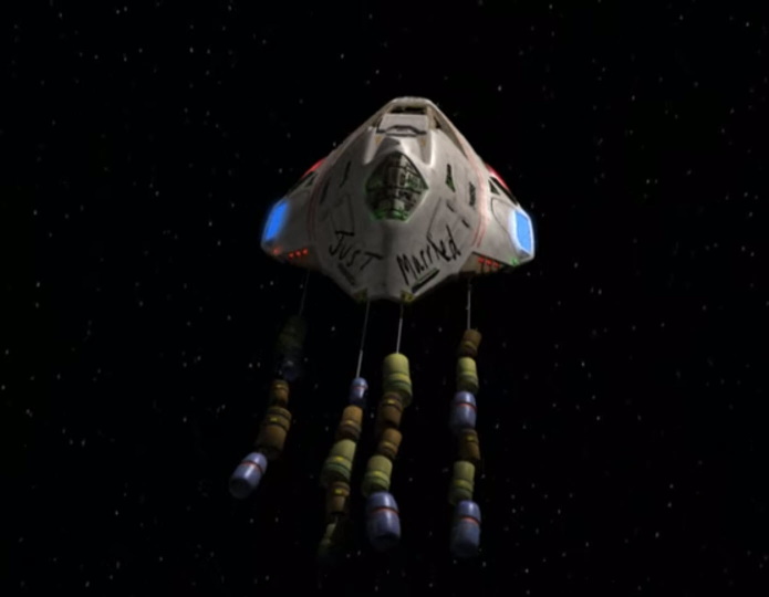 Soon Tom and B’Elanna begin talking about their relationship and it is soon clear that B’Elanna is concerned that they do not belong together. Tom stops their ship, knowing that he may lose the race so that he can help repair the relationship he has with B’Elanna. As this is going on, Harry learns that Irina is actually terrorist who oppose the current state of peace. She is using the race, and the fuel converter that was installed on the Flyer to send a message and spark hostilities. Kim is able to inform Paris using Morse code. Just as Tom is about to propose to B’Elanna as he realizes that he might lose her, they are interrupted by Harry’s message and swoop in to save the day. Tom proposes during the rescue operation and after they succeed in rescuing their friend (while also losing the race), the two marry and take a (once again) freshly repaired Flyer out for their honeymoon.