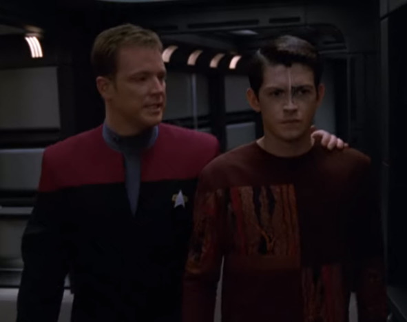 The B story involves Icheb falling for B’Elanna mistaking her encouragement for romantic intention. However B’Elanna, being married, clearly has no interest in the Teen Borg Boy but he is convinced nonetheless. Signals are mixed, hearts are broken but in the end Icheb realizes that he can not continue courting B’Elanna and ‘let’s her go’ much to her surprise.