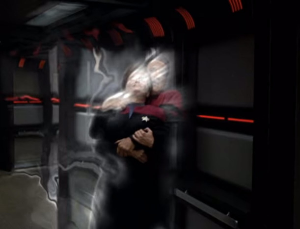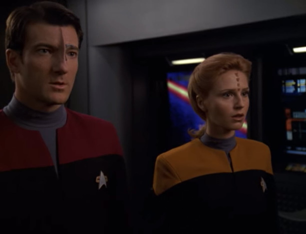 - Past Janeway insinuates that she has a thing for Chakotay when she asks if they ever ‘got close’.