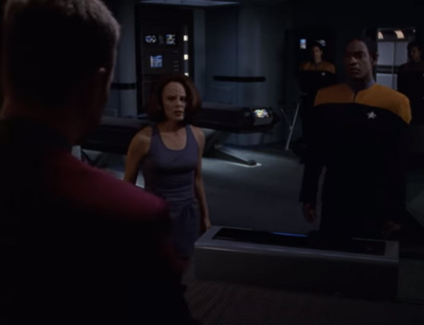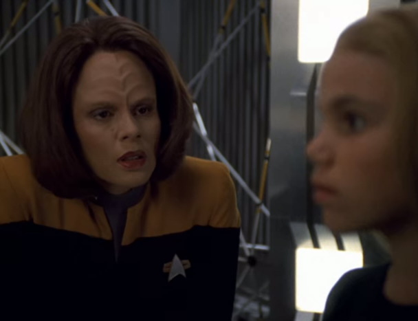 This is an episode that has been coming for some time. We have seen this self doubt crop up in B’Elanna time and again as she and Paris have gotten closer so, it is really no surprise when her anxieties manifest again when a child is brought into the picture.