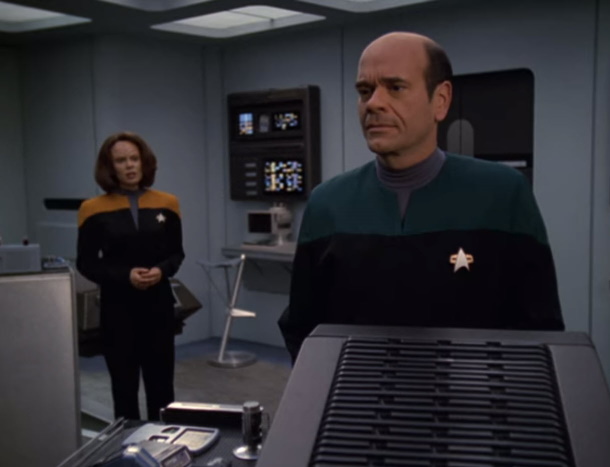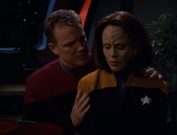 The thing that makes this episode so great is that it really dives into the ‘human’ side of the crew, namely Paris and B’Elanna, and how they adjust to their upcoming life change. Series like these tend to focus more on the ship as a whole and the ‘threat of the week’ but sometimes we get a chance to see a battle but not one with phasers and torpedoes but one of words and emotions. For B’Elanna, this is more than just altering her child’s appearance but her attempt at fixing her own past and her father’s departure. She has blamed herself for years because he left only 12 days after she herself told him that he should. While it is not reasonable to believe that he left because of this incident, B’Elanna is damaged and hurt hoping beyond hope that she does not have to relive the most painful moment in her life. Thankfully, Paris is the one person who would stand with her no matter what and their union is pretty special.