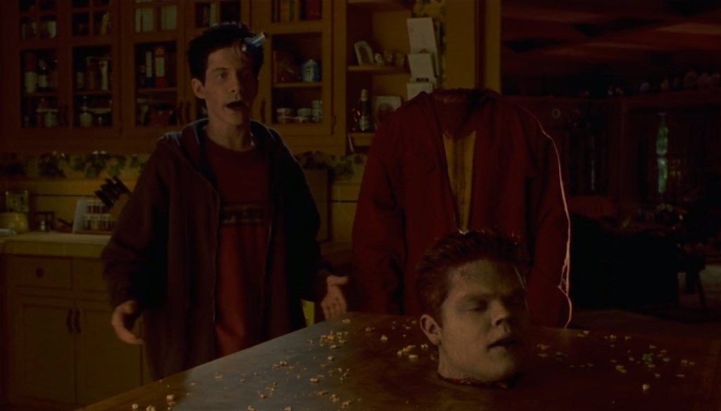 To start off, the cast in this is brilliant. Lead Devan Sawa, who you might remember from Final Destination and the Casper movie (yeah he was Casper!), is perfect in his roll as teen stoner who finds himself with a cursed hand. He owns his aloof and slacker nature so perfectly that he is utterly convincing the entire time. Not only that but he manages the possessed hand bit fantastically, well, while he has it… However, while he is good, it is his costars that really make this film a joy establishing this as more of an ensemble cast than a solo effort. Seth Green and Elden Henson play Anton’s stoner best friends, Mick and Pnub, who he kills but…manage to come back to life. These two are the true comic relief of the film acting as both best friends and stoner zombies for much of the film playing to Sawa’s straight man routine to perfection. These two have some of the best lines and nearly steal the show every time they are on screen together. While everyone knows Seth Green, you might recognize Henson from his more recent work as Foggy Nelson in Daredevil and even further back as Fulton in The Mighty Ducks. The guy is talented and even twenty years ago, it shows.Â