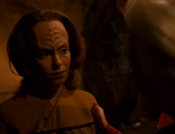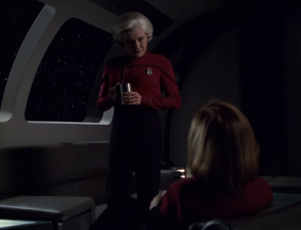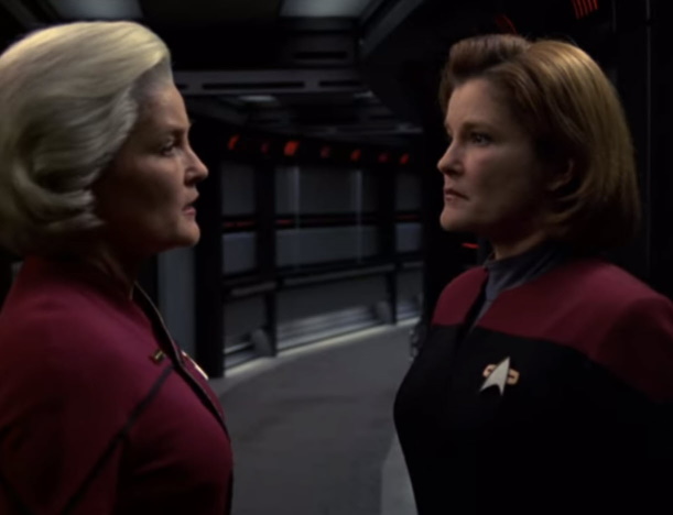 Back in the past Admiral Janeway arrives and asks that Voyager close the rift before the Klingons get through. Doing so, the Janeways meet and begin discussing Admiral Janeway’s presence there. Admiral Janeway (AJ) informs Captain Janeway (CJ) of some of the events that happen between now and her own future but Captain Janeway does not want to hear too much. AJ informs CJ that she has come back in time to get Voyager home, telling her that the borg in the nebula are the answer to this problem. CJ recalls the threat of the Borg to AJ but AJ informs CJ that her futuristic shuttle has technology that will protect Voyager from the Borg.