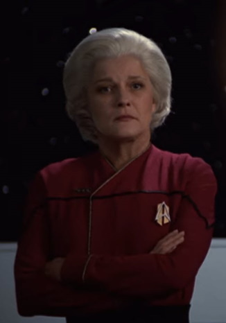 - Note Admiral Janeway’s uniform and Combadge, it happens to be the same as the All Good Things Future as seen on STNG.ย ย I have to wonder if this is not an alternate timeline now where not only did Voyager take another 20 years to get home but Picard and Crusher married and the Enterprise had three nacelles.ย