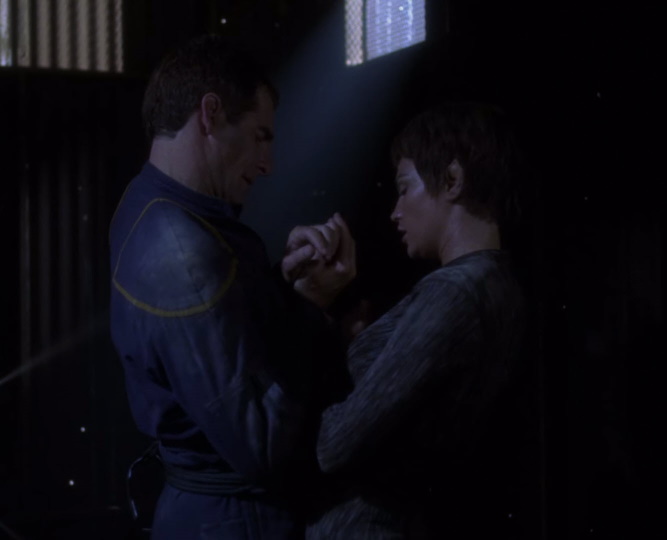 One of the things that makes this episode work so well is how T’pol has begun to recognize the changes in herself from being with a human crew while Archer has come to realize just how important T’Pol is to the crew.ย He makes it abundantly clear that he has no intention of relinquishing T’Pol to the Vulcans as he see’s her as part of the Enterprise crew, which is kinda funny as it wasn’t so long ago that he was very suspicious of her.