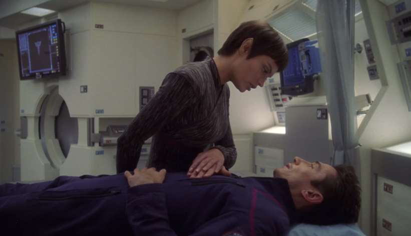 After adjusting the environmental controls to give them more time, Reed and Tucker find themselves freezing and begin to drink a bottle of burbon as they lament the loss of their friends aboard Enterprise. The two soon realize admit to one another that they respect each other even though they may have disagreements all the time. Still drunk, they receive Enterprise’s transmission and, although they are overjoyed, they will not have enough air to make it to the location. With no other options, they jettison and detonate their impulse engine, hoping that it serves as a signal flare to Enterprise. After one last drunken fight after Tucker agrees to jettison himself out of the airlock, the two awake to find themselves in the Enterprise infirmary. Archer informs Reed that they found them with only minutes to spare and, through her actions, T’pol assures him that this is not a dream.