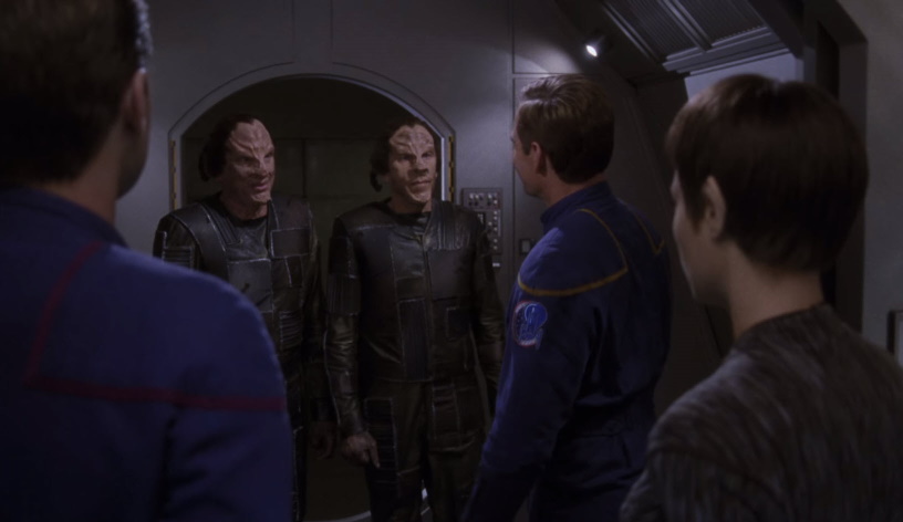 Not only that, there is even a moment where Archer and T’Pol end up having some kind of bs tribunal court room moment to trick Prill into talking to them about his partner.ย None of that scene makes any sense at all seeing that Prill’s partner just essentially kidnapped one of their crew and damaged Enterprise in the process.ย Why they even go through with this is beyond me because surely there could have been a much less…dramatic way to go about it like, I don’t know, maybe tossing him into the brig or letting Dr Phlox give him some truth serum?ย ย