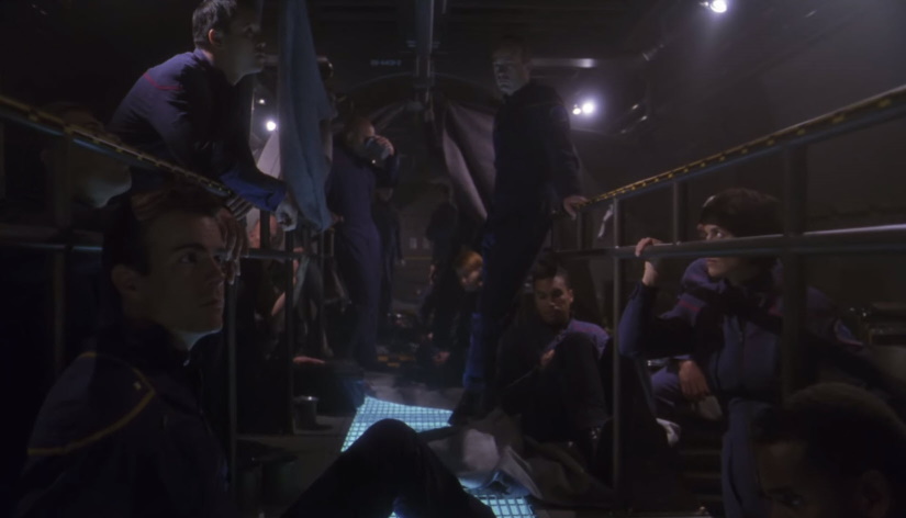 Preparing for an away mission, Enterprise is contacted by Rellus Tagrim who suggests that Enterprise depart soon and take his crew with them as a neutronic storm is about to hit that will be quite dangerous. After allowing Tagrim’s people aboard, Enterprise begins to try to outrun the wave but soon discovers that it will be enveloped prompting Dr Phlox to recommend finding a shelter in the ship that can protect the crew. Soon most of the crew, along with Tagrim’s people huddle up in the catwalks located in the Warp Nacelles so that they can ride out the storm in safety.
