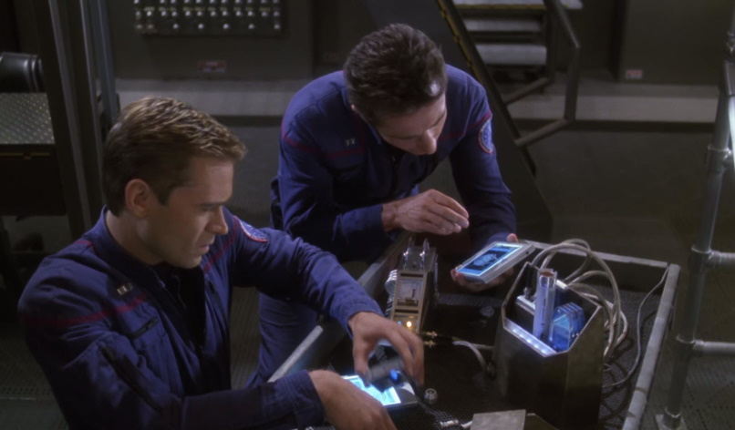 After discussing the matter with Admiral Forrest,ย the ship encounters a Suliban vessel who claims the ship is theirs regardless of the fact that a human body was found inside.ย Archer refuses to relinquish the ship and Enterprise is attacked.ย A brief battle commences, including Suliban infiltrating the ship, but after Enterprise escapes the attack, Trip and Reed begin working on the ship only to discover that it is much larger on this inside than out, indicating that this is more than just an escape pod.ย Archer is shocked when Phlox informs him that the human body has ben genetically altered in some way as it shows both Vulcan and Terrellian dna as well, suggesting that this is no mere human but a child of considerable interspecies relations.ย Suspecting this person is from the future, Archer consults Crewman Daniel’s database and learns that this time ship is from nearly 900 years in the future.ย This explains why the Suliban were so interested in it and Archer has no intention of letting them have it.