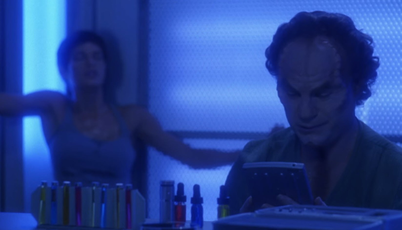 Back on Enterprise, as Tucker tries to track down Archer, the microbe causes T’Pol to begin losing control of her emotions leading to her to begin Pon Farr much to Phlox’s dismay. Soon it becomes a matter of life or death as T’Pol must mate, or die. Resisting any medical treatment T’Pol tries to either mate with Phlox or escape to find someone else. Soon she becomes delirious and manages to escape decontamination causing Phlox to seal off the entire deck for the safety of the crew. Reed and his security team goes after T’Pol and, after a skirmish manage to subdue her.