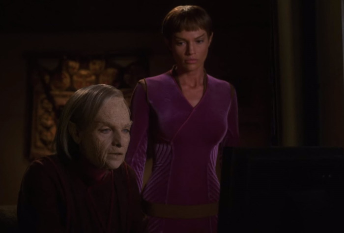 I would be remiss if I didn’t mention the biggest, and possibly most impactful story development that this episode provided. No, I’m not talking about the Xindi story, I am talking about the romance of Trip and T’Pol. Since earlier in the series there has been a growing connection between these two. Although a very unlikely couple, it seemed as if their relationship had finally reached it’s zenith when they, well, consummated it a few episodes back, However, it seems that T’Pol has been having second thoughts because she might have been under the influence of a drug and, is a might concerned that she is losing control of her emotions. To his credit, Tripp has been a gentleman and, even though he is sure that any chance of a relationship is over, he still wants to be her friend if she needs one. Enter Old T’Pol. Upon learning that she and Tripp had married and had a child together, young T’Pol found herself even more distraught and, eventually, sought out clarity from her future counterpart. It was there that her future self told her that what T’Pol is going through with her addiction will never be corrected and that she will have to learn to deal with her feelings from that point on. In fact, it was Tripp who helped save old T’Pol from losing herself in these new feelings and, it would probably be in young T’Pol’s best interest to treat him a little better. This, of course, sets up some future events that I won’t spoil for you here but, needless to say…well…this story is not quite over yet.