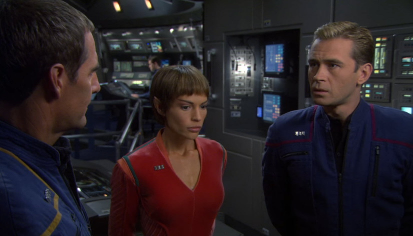 - ย Take note of T’Pol’s uniform in this and the last episode. Even though she is now an official member of Starfleet, complete with rank insignia, she is still wearing a very different outfit than the rest of the crew…seems someone is getting the Diana Troi treatment.