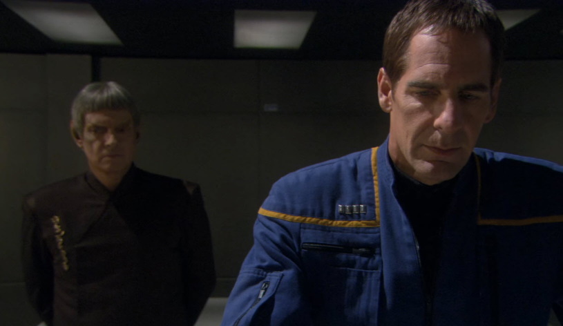 Back on Enterprise, Soval accuses Stel of bombing the Embassy after seeing him doing it during a mindmeld with a witness who is in a coma. T’Las is distcusted that Soval used a mind meld and insists that the Ambassador turn himself in, ignoring the fact that Stel is likely the bomber. Soval agrees to turn himself in and assures Tucker that it is for the best as he can finally expose the truth. On Vulcan, T’Pol, Archer and Arev are accosted by a lightning storm where Arev and T’Pol are struck. Just before dying, Arev mind melds with Archer asking the Captain to take something to the sanctuary.