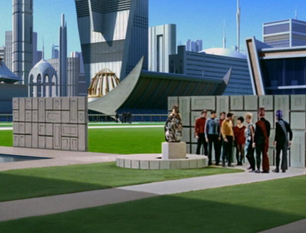 Enterprise visits a planet who appears to be at war. On the demand of Ambassador Fox, Kirk and team beam down only to discover that this planet simulates wars and, after the simulation is completed, the casualties calculated simply line up and to be executed.ย There they learn that the Enterprise has been calculated as destroyed and the crew is given 24 hours to report for termination.ย The landing party is jailed and the Eminians (who are at war with the Vendikar) attempt to trick the rest of the Enterprise crew to beam down.ย Scotty doesn’t fall for it despite the demands of Ambassador Fox to sent the crew to the planet. On the surface, Spock uses telepathy to help the team escape.ย