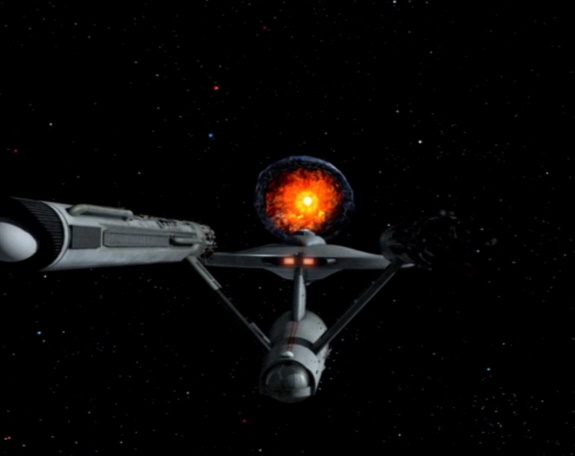 Kirk arrives with the damaged Constellation and, with their plan in place, Kirk flies the starship into the Doomsday Machine’s maul beaming out moments before the ship detonates, killing the creature and saving countless lives.